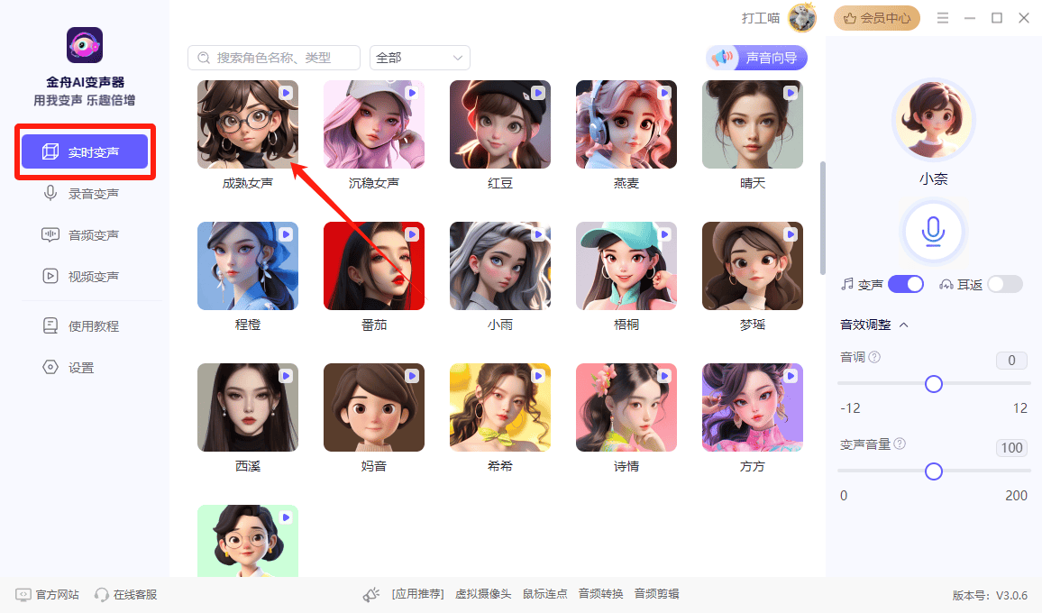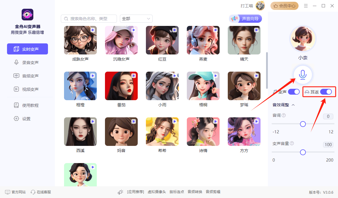 步骤3:预览变声效果。打开麦克风按钮即可开启实时变声,开启「耳返」可以预览变声效果,与他人聊天时,建议关闭「耳返」效果;