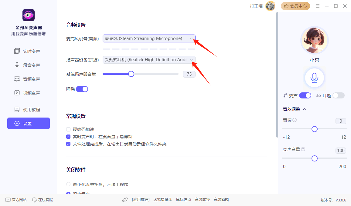 步骤1:准备好耳麦设备,设置输出输入设备。电脑打开金舟AI变声器,选择设置,将插入的耳麦设备选择作为麦克风设备和扬声器设备;