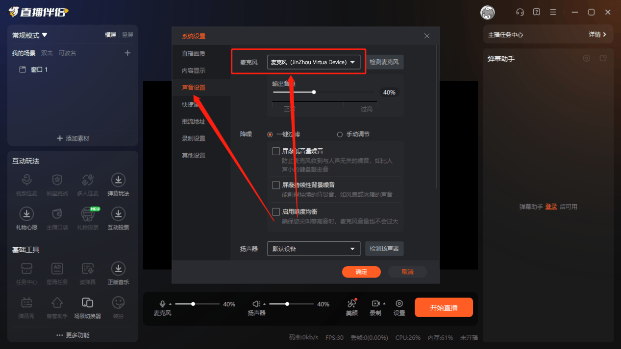 步骤4:设置设备。如果您是要进行游戏连麦,可以在游戏的声音设置中,将麦克风为「麦克风(JinZhou Virtua Device)」。