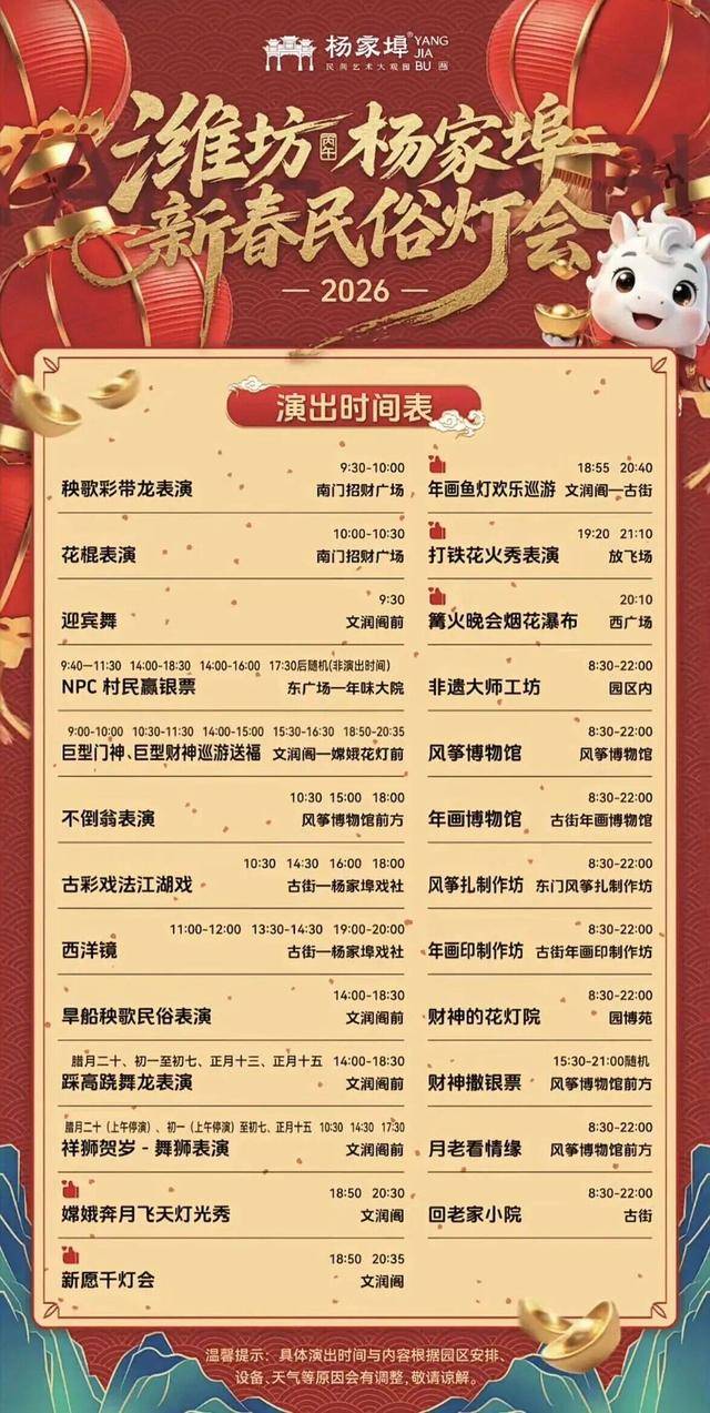 活动内容:马年主题花灯展、超大财宝花灯院将节日氛围感拉满,非遗打铁花火光四溅,火壶火刀火秀惊险刺激,还有嫦娥飞天3D塔楼灯光秀、年画鱼灯巡游,游客可逛花灯、祈福愿,尽享浓郁年味。